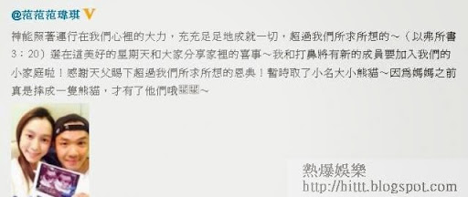 今早范范喺微博宣布與老公造人成功,而且今次係一炮雙響──懷有雙胞胎呀,恭喜恭喜﹗