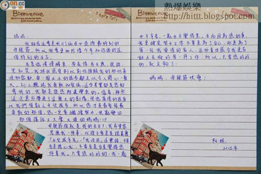 信中一開始,Jinny感慨謂今個母親節是兩母女最特別的日子,故格外珍惜,並指母親是其學習榜樣:「別人總誇我勇敢和堅強,我都是從你那邊學來的。」對於母親自意外所承受的痛苦,及身為女兒的自責,Jinny明顯受壓多時,終於藉着此信說出心底話:「不要老是說甚麼『女兒很辛苦、我沒有』這些話,不要老是擔心我,自責覺得你拖累我……作為女兒最大的心願是只要你好好的,就足夠了」。將於23日生日的她許願,望母親盡快康復:「快點變回那個講話又大聲、又煩的媽媽。」原名吳嘉妮的Jinny以「阿妮」作為下款,相信吳母收到信後定必對女兒的愛感受至深!