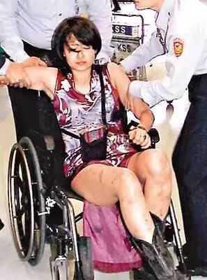在桃園機場因神志不清再次被拒登機,更情緒失控坐在地上,手臂及大腿則布滿瘀痕。