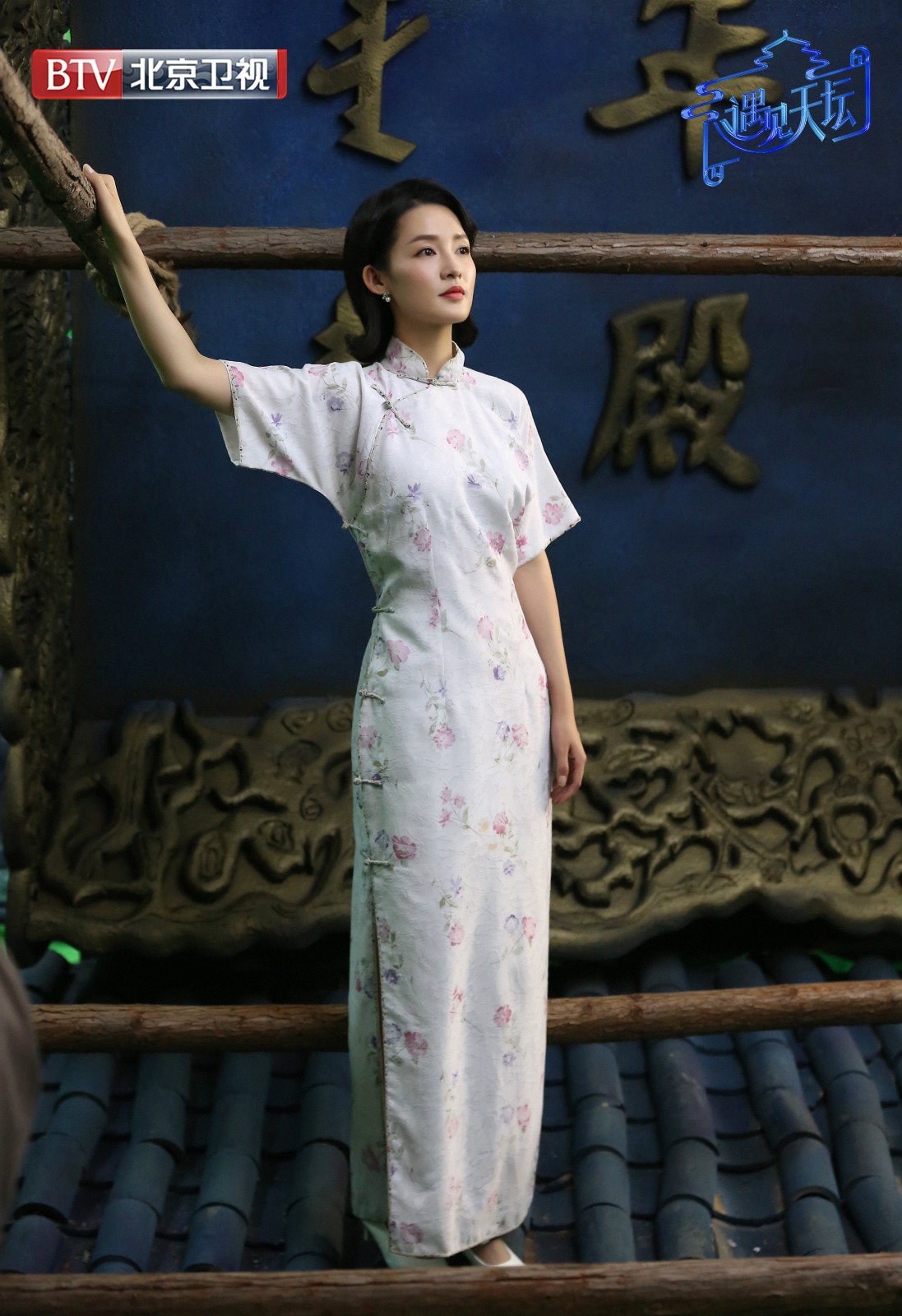 李沁在《遇見天壇》節目中,扮演《人間四月天》的林徽因,白色碎花旗袍,顯出了她的纖幼腰肢,十分優美。(網上圖片)