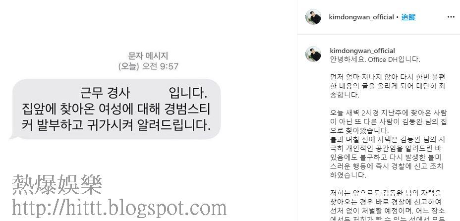 韓國長壽男團神話的40歲成員金烔完於上周六(23日)遭私生飯(追蹤明星私生活的粉絲)翻牆闖入寓所,其所屬社Office DH隨即公開該私生飯照片,及發表聲明勸阻不要做出到藝人住所的舉動,但警告無效,短短5日金烔完的寓所又再遭另一私生闖入。