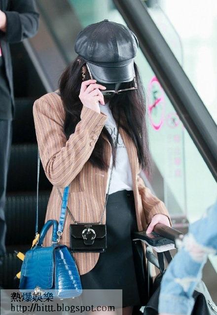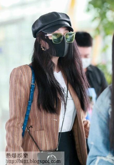 范冰冰着上內地品牌ILOVEPRETTY 的啡色條紋外套,胸前勾着海綿寶寶的公仔,內搭白色T-Shirt 和Louis Vuitton 黑色短裙,加對女星至愛的Stella McCartney 厚底鞋晒腿,造型休閒,同時戴上軍帽、口罩和Gentle Monster 黃色太陽眼鏡,又親自拿行李,相比起以前排場明顯變弱。