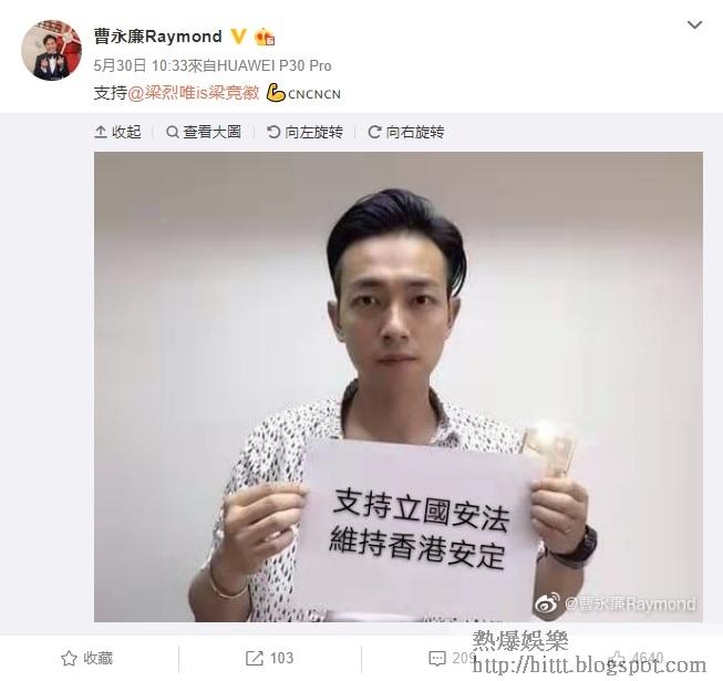 【聯署撐仲未夠】曹永廉借梁競徽過橋微博表忠港版國安法30分鐘前內地硬推港版國安法,「香港文化演藝界」日前聯署支持港版國安法,當中除了成龍、譚詠麟及鍾鎮 ...