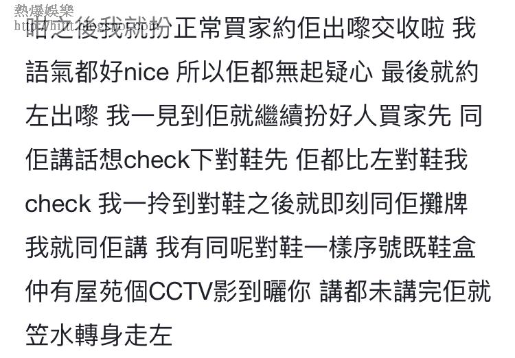 事主之後裝作普通買家約見交收,直至面交時才戳破賣家為偷鞋賊,而該偷鞋賊聽畢即急忙逃跑。事主見失鞋已得,亦未有報警處理,但其後仍有利用 WhatsApp 勸對方收手,指是次事件會冷處理,但事主見其並無悔改之心,遂將事件放到網上平台。