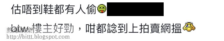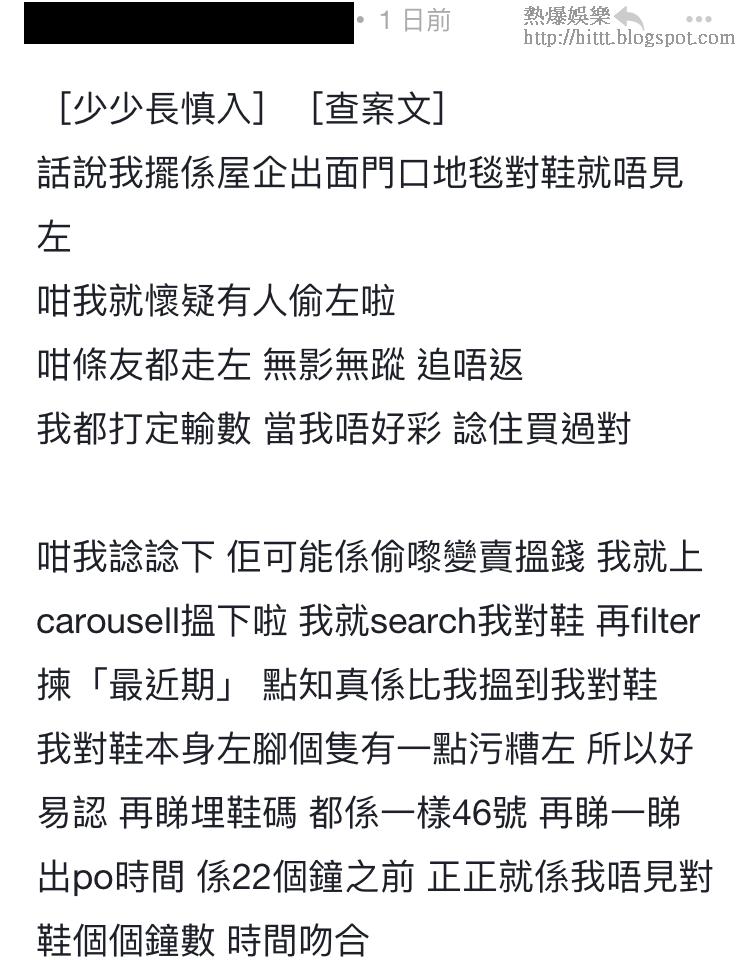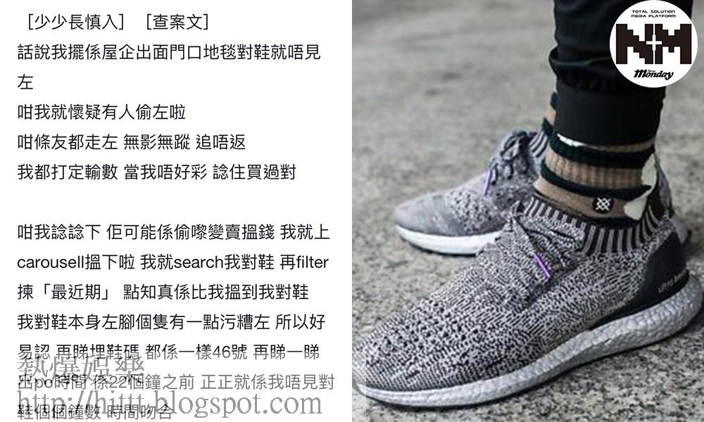 事主指自己居於沙田馬鞍山屋邨,同層鄰居一直會將鞋放於門外地毯,多年來相安無事,惟近日被偷走一對鞋,更是一雙潮鞋Adidas Ultra Boost Uncaged,售價約$1千多至2千不等,事主事後揣測偷鞋賊有可能會將鞋轉售,故隨後到網上買賣平台搜尋其失鞋型號,