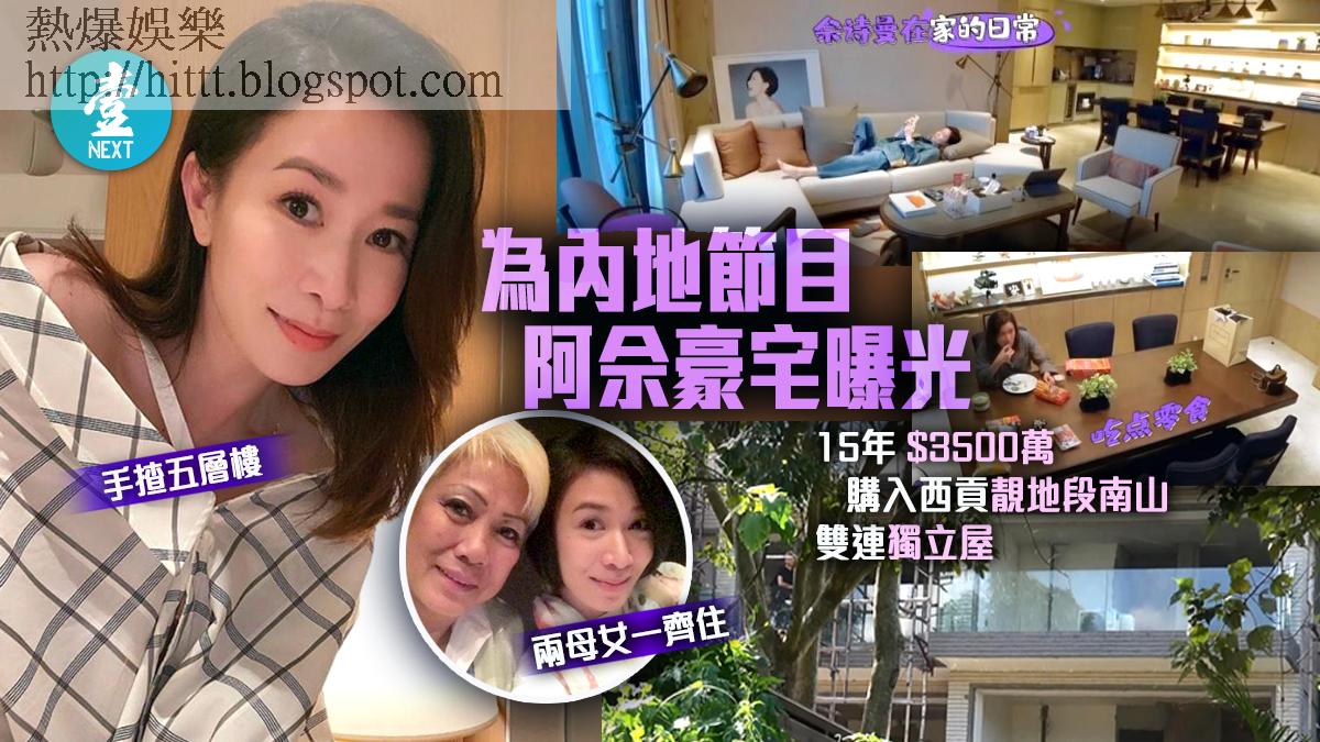 最近為內地綜藝節目《看我的生活》,展示其日常生活同時,豪宅亦攝入鏡。是圈中富婆的她,曾被揭手揸五個磚頭,身家早已億億聲。除11年,以一千八百多萬購入自住的畢架山帝景峰,及分別在12年與13年間,以三千多萬買入跑馬地紀雲峰一個千呎單位,和八百萬的紅磡昇御門,15年亦繼續大出手,一口氣在西貢優質地段南山買入背山面海的兩幢相連獨立屋,一間送阿媽,一間獎勵自己,讓一向孝順的阿佘可跟母親住得近有照應,又有自己獨立空間。入伙後屬廚藝高手的佘媽,更不時招呼好友到其西貢豪宅宴客。