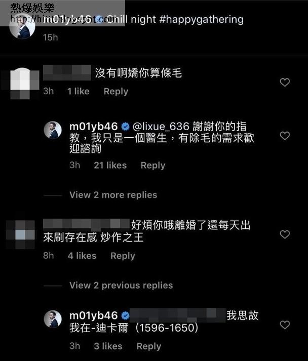 有網友狠批「沒有啊嬌你算條毛」,佢神回覆兼借機宣傳:「謝謝你的指教,我只是一個醫生,有除毛的需求歡迎諮詢」有網民問:「還有心情?」,佢亦回應:「新不了情」當有網民鬧佢:「好煩你哦離婚了還每天出來刷存在感炒作之王」,佢則引用法國哲學家笛卡兒名言:「我思故我在-迪卡爾(1596-1650)」