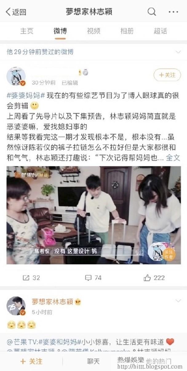 不過有網友就發現林志穎原來最近公開點讚一個社交網帳號發文,該帳號指節目組為博眼球,故意將林媽媽與陳若儀相處片段剪輯成尷尬場面,不過隨後林志穎極速Unlike。到咗今日,林志穎直頭發文力撐媽咪,表示每個父母親對孩子絕對都是滿滿的愛與呵護,而節目有佢呈現畀觀眾嘅方式,自己好愛自己媽媽同妻子:「我們互相疼惜,珍惜每次的相處!」言語間暗指節目組亂剪接,影響外界對佢媽媽嘅觀感。