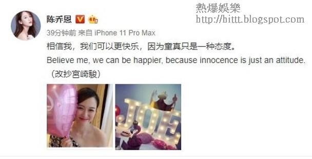 不過件事仲未完,唔知係咪自知發文引起大眾聯想,今日一早陳喬恩就將原先嘅發文刪走,並重新上載靚相,當中嘅文字就改為:「相信我,我們可以更快樂,因為童真只是一種態度。Believe me, we can be happier, because innocence is just an attitude.(改抄宮崎駿) 」失戀金曲變快樂童真,真係令人𢱑晒頭…而身在英國嘅佢,亦上載多張新照,其中佢更他鄉遇故知,撞見胡兵並即時合照,不過男友Alan依然唔見影。