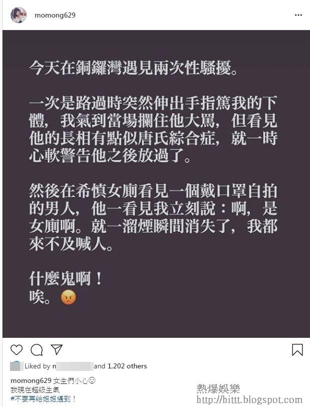 事緣昨日吳沚默在銅鑼灣遇見兩次性騷擾,續道:「一次是路過時突然伸出手指篤我的下體,我氣到當場攔住他大罵,但看見他的長相有點似唐氏綜合症,就一時心軟警告他之後放過了。」