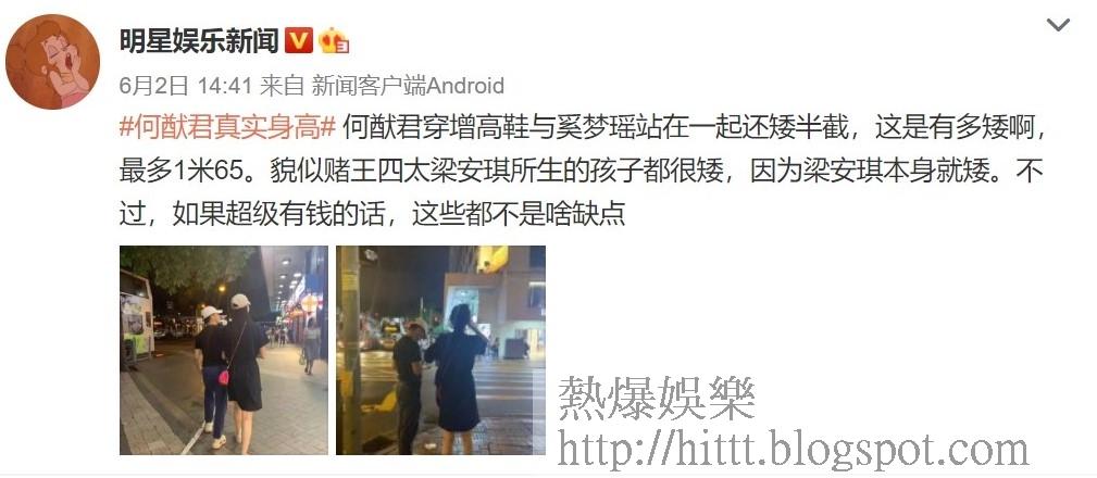 澳門賭王何鴻燊上月26日病逝後,其四房兒子何猷君不久即成為熱議對象,就連他的身高也被拿來討論,事關有網友上傳了他與妻子奚夢瑤在街頭並肩而行的照片,明顯可見男方的高度比女方差了一截,而大陸的娛樂新聞微博更大膽評論:「何猷君穿增高鞋與奚夢瑤站在一起還矮半截,這是有多矮啊,最多1米65。貌似賭王四太梁安琪所生的孩子都很矮,因為梁安琪本身就矮。不過,如果超級有錢的話,這些都不是啥缺點。」