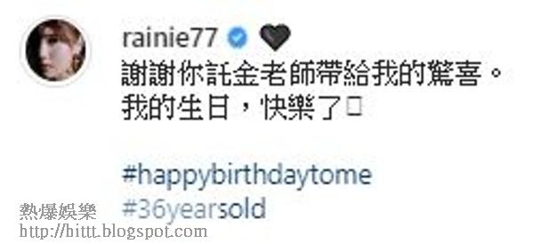 楊丞琳上載咗「一家三口」合照,留言答謝老公:「謝謝你託金老師帶給我的驚喜。我的生日,快樂了#happybirthdaytome #36yearsold」唔少圈中藝人包括陳妍希、黃鴻升、歐陽妮妮、徐濠縈等留言送上祝福。