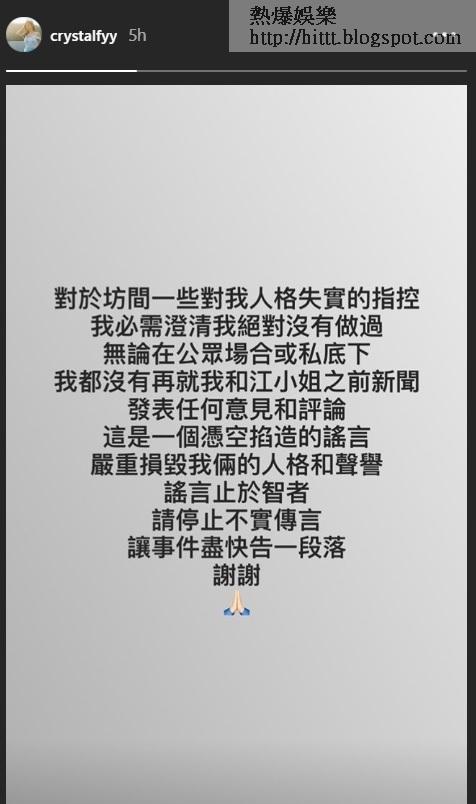 至於被踢爆是「大話精」的馮盈盈今日凌晨亦有在IG Story反擊:「對於坊間一些對我人格失實的指控,我必需澄清我絕對沒有做過,無論在公眾場合或私底下,我都沒有再就我和江小姐之前新聞發表任何意見和評論,這是一個憑空掐造的謠言,嚴重損毀我倆的人格和聲譽,謠言止於智者,請停止不實傳言讓事件盡快告一段落,謝謝。」