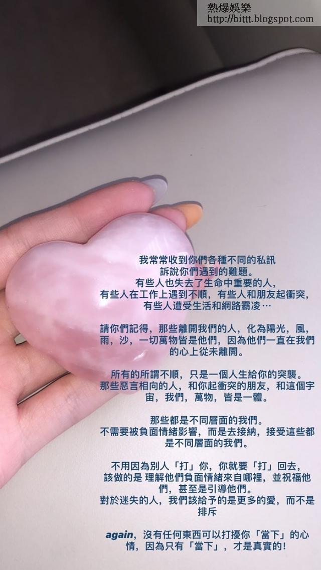 Bella更撰文分享她的人生觀:「所有的所謂不順,只是一個人生給你的突襲,那些惡言相向的人,和你起衝突的朋友,和這個宇宙、萬物、我們皆是一體,那些都是不同層面的我們,不需要被負面情緒影響,而是去接納這些都是不同層面的我們。」