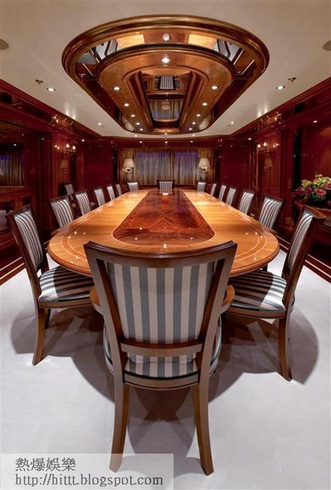 再下一層的甲板,設有另一個飯廳,酒吧和遊戲枱,豪華主人房亦設於此層。九間客房則設於遊艇的最底層。船上更設有車房,可放置多部名車,到達目的地後即可駕車外出。