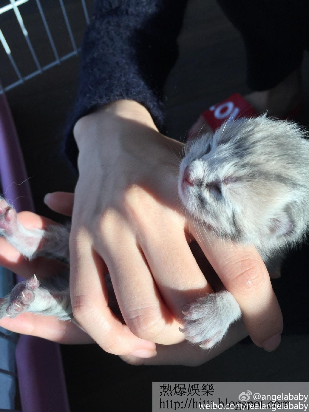 媽媽真偉大!小貓B剛出生時,只有手掌般大小。(微博@angelababy)