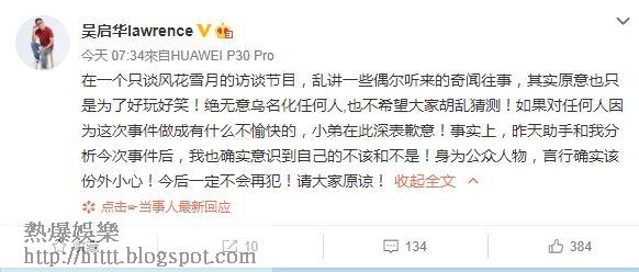 今日吳啟華忽然「下跪」,在微博留言道歉,對於自己講出大陸「萬人迷」女演員給全劇組房號,他稱自己是在一個談風花雪月的訪談節目,亂講一些偶爾聽來的奇聞往事,其實只是為了好玩好笑,絕無意「污名化」任何人,不希望大家胡亂猜測,並向受此事影響或感到不愉快的人道歉,昨日他跟助手分析此事後,他強調:「確實意識到自己的不該和不是,身為公眾人物,言行確實該份外小心,今後一定不會再犯!請大家原諒。」