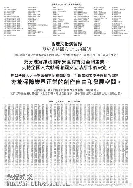 日前有名為「香港文化演藝界」所發出的聯署名單,表示共有2605人聯署支持「國安立法」,希望「保障業界正常創作自由和發展空間」,支持惡法但又要自由,認真矛盾。