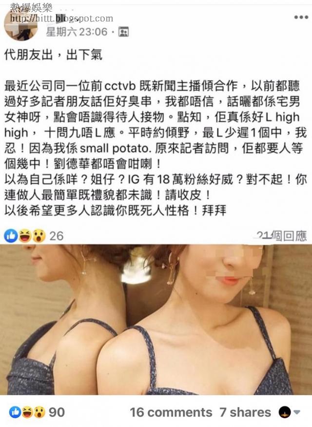 不過,有網民日前在FB以揞名爆方式,鬧爆有人「臭串」及「例牌遲到」,更直指「你連最簡單的禮貌都未識」。帖文內容稱是代朋友發文:「最近公司同一位前cctvb嘅新聞主播傾合作,以前都聽過好多記者朋友話佢好臭寸,我都唔信,話晒都係宅男女神呀,點會唔識得待人接物。點知,佢真係好L high high,十問九唔應。平時約傾嘢,最L少遲1個鐘,我忍!因為我係small potato,原來記者訪問,佢都要人等個幾鐘!劉德華都唔會咁喇!以為自己係咩?姐仔?IG有18萬粉絲好威?對不起!你連做人最簡單嘅禮貌都未識!請收皮!以後希望更多人認識你嘅死人性格!拜拜!」雖然帖文未有開名,並貼上加上馬賽克的照片,「有人」是誰不言而喻。