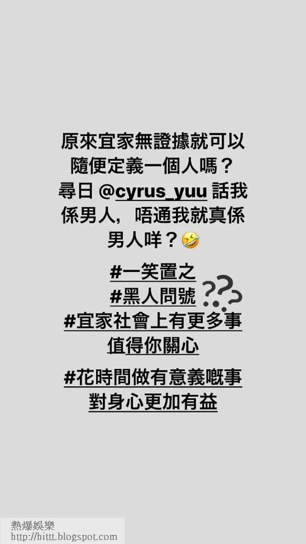 陳嘉倩對於「指控」,凌晨喺社交網間接回應話:「原來依家冇證據就可以隨便定義一個人嗎?尋日余浩宗(前無綫電視新聞主播)話我係男人,唔通我就真係男人咩?」佢又Tag住「一笑置之」、「依家社會上有更多事值得你關心」、「花時間做有意義嘅事對身心更有益」!