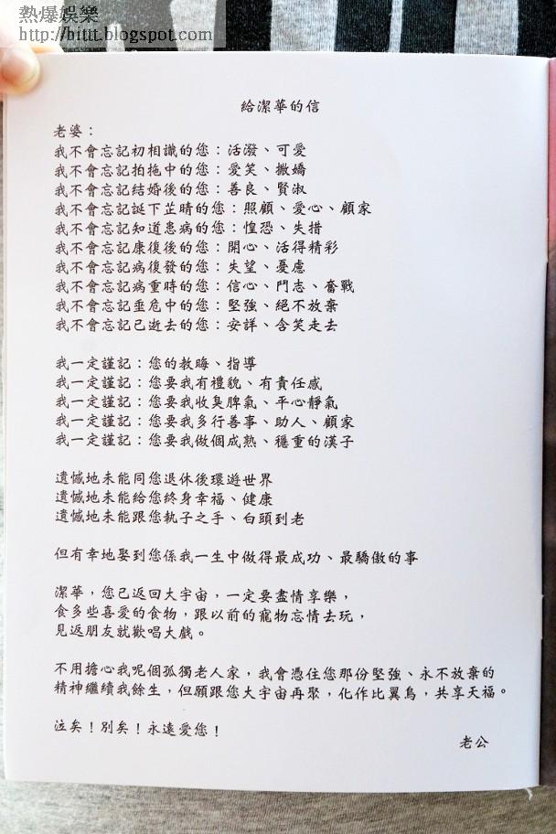 芷晴則透露有意為媽咪舉行大戲展覽:「媽咪生前有諗過出年表演,我希望幫佢完成,但我功架冇佢咁好,所以都係做統籌同做小禮物,喪禮小冊子都係我設計,入面有媽咪生前畫作,亦有爸爸同我畀媽咪嘅信。」