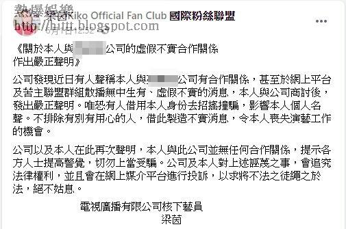 由於梁茵捲入層壓式推銷金錢糾紛在FB和連登瘋傳,「梁茵Kiko Official Fan Club 國際粉絲聯盟」FB專頁,分別於6月1日及2日發聲明,澄清自己沒有加入傳銷公司,並指「唯(惟)恐有人借用本人身份去招搖撞騙,影響本人個人名聲。不排除有別有用心的人,借此製造不實消息,令本人喪失演藝工作的機會。」保留法律追究權利,但仍有大批網民洗版留言,指控梁茵是傳銷員,還列出獨立經銷商號。