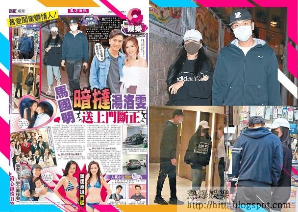 昨午3時半,靚湯駕車返回位於紅磡的寓所,五分鐘後見馬國明的座駕現身,並把車泊到時鐘訪客車位。兩人在「雯居」相聚四小時,直至晚上7時45分才雙雙步出寓所大堂。他倆頭戴鴨舌帽及身穿深色長袖上衣,打扮襯到絕,並徒步到附近商場內一間售賣電話零件的小店,雖全程沒有拖手並肩而行,但步伐一致默契十足。問到兩人是否拍拖、戀情開始多久及是否已見家長等等問題,兩人均沒有回答,靚湯見到記者追訪時一度合十雙手。店內逗留約數分鐘,期間靚湯問馬國明問題,兩人頭貼頭蜜蜜傾,之後一同離開。記者再度提問是否拍拖?獲靚湯愛情滋潤的馬國明「重拾雄風」,Man爆護花並開腔:「唔講住,等有合適場合會再交代。」其後齊齊步行回靚湯寓所,馬國明臨入閘前仍親切地向記者揮手拜拜。