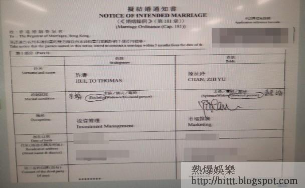 昨日本報發現Balia在本月8日遞交擬結婚通知書,並報稱從事市場推廣,而新郎許濤(Thomas)報稱未婚及從事投資管理,二人報住同一個港島區地址。翻查資料,擬結婚通知書上新郎的中、英文名字均與今年4月底正式出任電視廣播有限公司董事局主席一職的許濤相同。