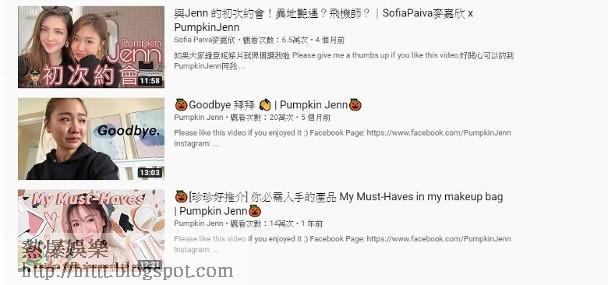 Pumpkin Jenn在2013年開始當KOL,樣靚身材正、身懷D Cup「胸器」的她,主打是分享化妝及護膚技巧,加上常常分享火辣性感照,故更受網民追捧,認為她夠陽光活力,形象討好,每段短片瀏覽次數動輒超過20萬,5年前她拍短片宣布失戀,瀏覽次數更超過46萬。