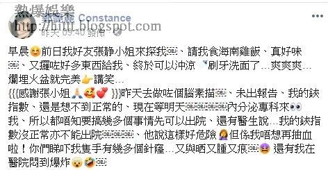 近期鄭艷麗因厭食症要入ICU留醫,其實早於去年3月,她的健康已出問題,當時更在FB留言:「身體好差,希望身體唔好再繼續差落去。」事隔三個月後,情況沒好轉,她寫道:「我身體狀況好差,體重又跌得好利害。」