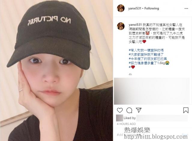 陳妍希在IG說:「我真的不知道其他女藝人在隔離期間是怎麼瘦的,之前體重一度來到歷史新高,我可是花了九牛二虎之力才減回年前的體重的,可能我不是女藝人吧……」她又落tag留言問:「有人和我一樣變胖的嗎」、「大家都變胖就不難過了」,而陳妍希更在post尾澄清「努力健身還多重了1.6kg(約3.5磅)」。