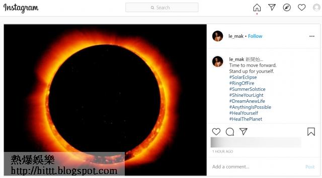 不過,Alex今天更新社交平台,相片是一張日食照,他以中英雙語留言稱:「新開始……Time to move forward. Stand up for yourself.(是時候向前走,為自己站起來。)」明示自己有新發展,不過他未有詳細透露自己的去向,但從他的tag提到「dream a new life」和「anything is possible」來推測,他的心態十分正面和積極。《蘋果》就此事聯絡過Alex,但暫未獲回覆。