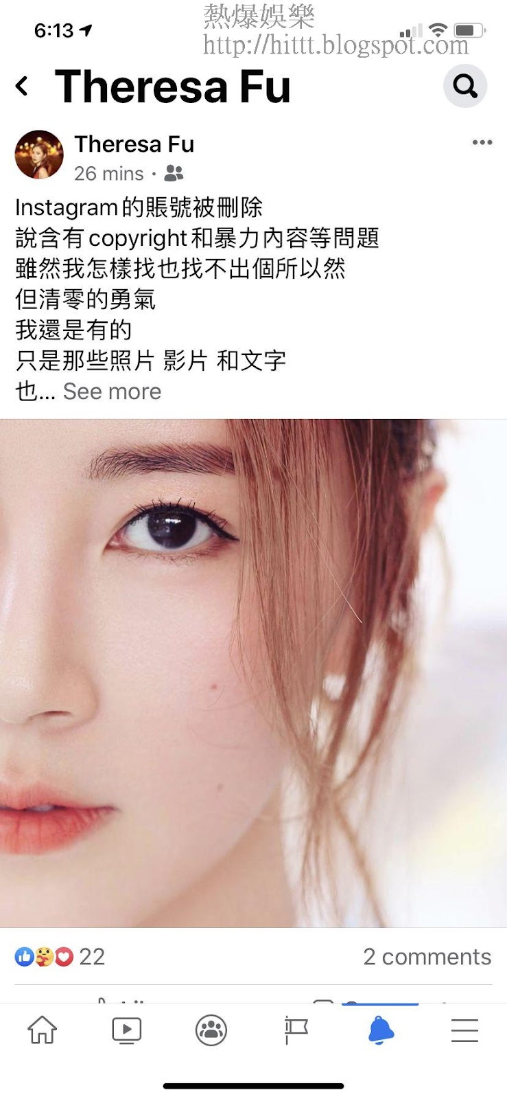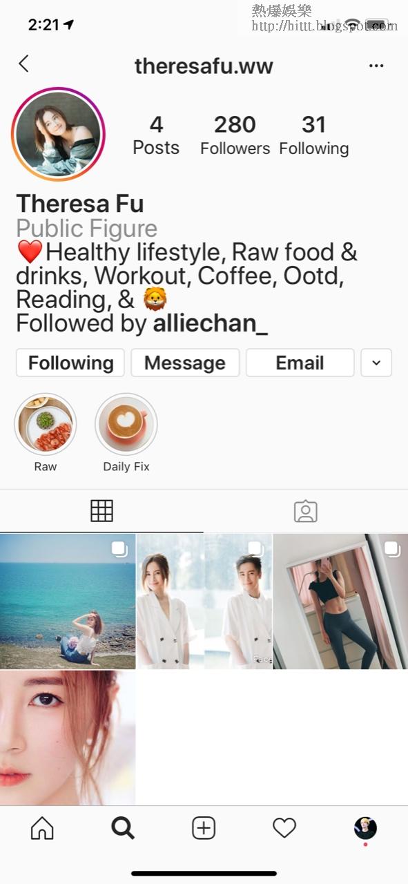 去年由內地回歸香港發展的傅穎(Theresa)話咁快35歲,返港後撞正社會運動同新冠肺炎疫情,所以Theresa都冇乜工開,好彩世上有ig。之前Theresa玩微博玩得好瘋狂,而家玩ig亦玩得好癲,日日都有Post,仲係咁拍片教人整健康瘦身飲品同食品,變瘦身界KOL成日要出鏡,所以日前見佢去買運動褲,無得試,齋摸質地都照入手,睇嚟趕住用。截稿前得知Theresa嘅ig被刪除,原因係含有暴力內容等問題,乜都冇晒,慘嘞。