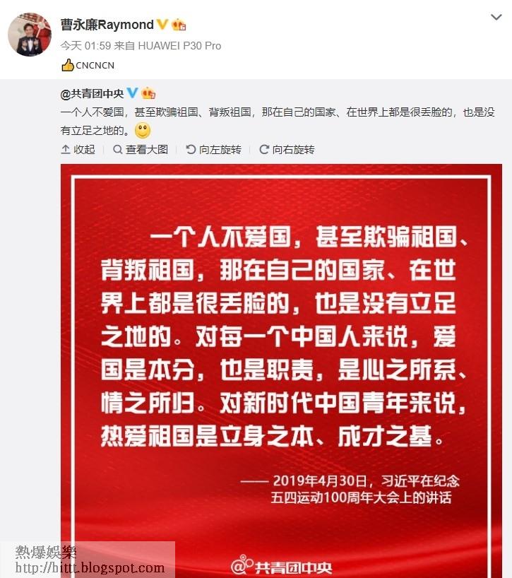 今日凌晨,55歲的曹永廉在微博轉發「共青團中央」一則關於「新時代中國青年熱愛祖國」的帖子。仔細看看,原來是節錄自2019年4月30日,習近平在紀念五四運動100周年大會上的講話。