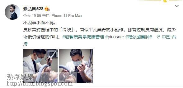 賴弘國今晚在微博貼出兩張自己正為客人處理Laser時的照片,雖然賴弘國當時是處於台北市的公司中,他標註的地點卻是「中國·台灣」。翻查賴弘國過往在微博中出的post,就會發現他標註的地點通常是中國、台灣兩邊彈,一時是「中國·台灣」,一時又會是「台灣·台北」,似乎身為台灣人的賴弘國依然未分清台北到底是在中國還是在台灣。