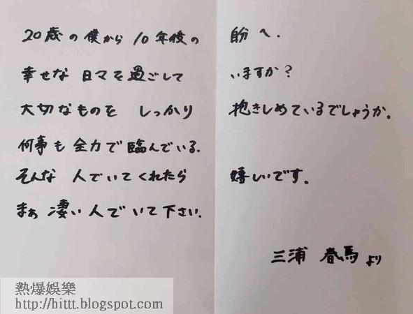 三浦春馬曾在20歲的寫真集中,他親筆寫:「20歲的我寫給10年後的自己。現在的你是否過住幸福的日子呢?有好好緊抱着最重要的事物吧!如果有人能夠做任何事也全力為你,那就太好了,請繼續成為一位厲害的人吧。三浦春馬上」豈料剛在10年後,三浦春馬竟選擇自殺來了結生命,突如其來的死訊讓Fans傷心不已,這封10年前的信在網上流傳後更令網民鼻酸。