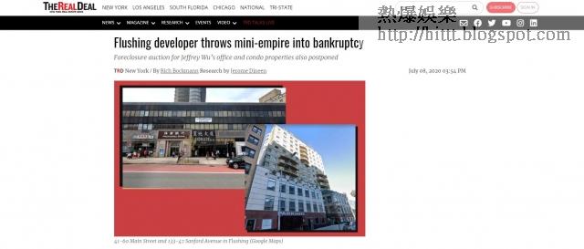 報道指法拉盛開發商和超市老闆胡兆明旗下3間有限公司申請破產,旗下物業原定在美國時間周三(8日)舉行拍賣,用以支付約1,530萬美元(約1.18億港元),不過拍賣最後被推遲,他早前曾以另一名字Myint J. Kyaw在紐約東區法院申請個人破產,他未有對報道作回應。3間有限公司物業包括法拉盛市中心一幢10,000平方英呎的辦公樓和零售大樓、位於Sanford Avenue的50個公寓單位、位於唐人街的28,000平方英呎的商業公寓及一個面積達184,000平方英呎的工業園區。