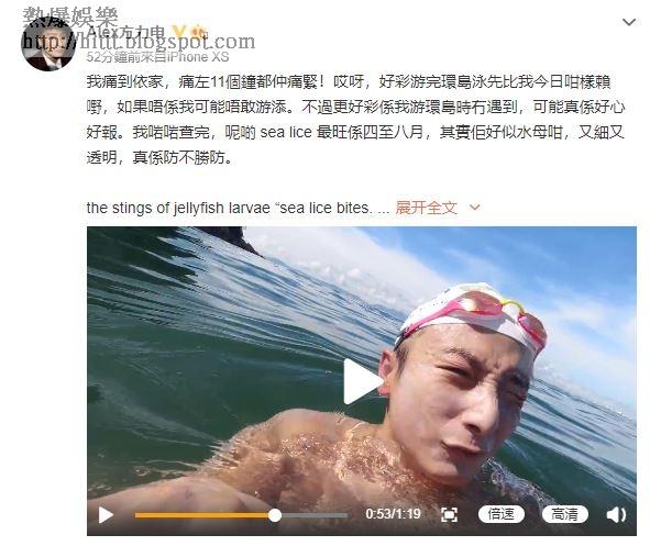 小方今日在社交網站中上載了一條昨日在水中拍攝的短片,片中他先講述自己從淺水灣游到赤柱碼頭,然後再返回淺水灣,泳程約10公里,不過小方指當自己游了2公里左右後卻被海蝨咬,而片中的他亦痛到語無倫次地說:「炸我呀咬我呀?釘我呀食我呀?我唔知乜嘢,哇我痛到成塊面好似畀火燒咁,跟住膊頭、心口、頸,全部都係,佢哋(游友)話本來痛一分鐘就冇,但我而家痛咗半個鐘頭都仲咁痛,好痛呀!黐線!我都話唔游海㗎啦,好辛苦呀,好唔鍾意游海呀,好痛呀!陣間仲要問佢哋點樣可以消除呢啲痛。」只見他邊講邊露出「咪」眼、皺眉等表情,狀甚痛苦。