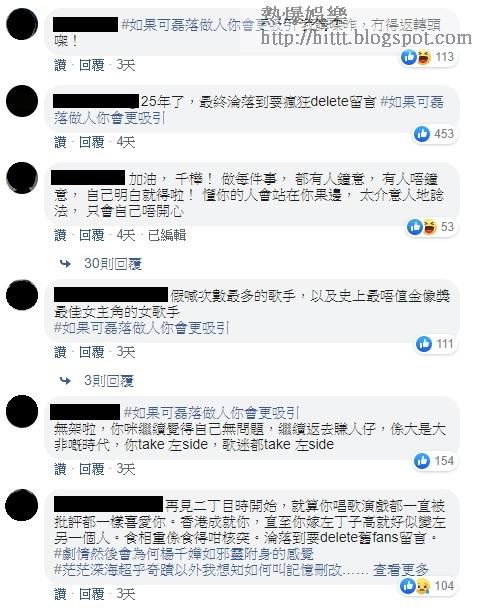 雖然有歌迷表示繼續力撐千嬅,但也有網民留言千嬅為賺人仔跪低「你令到好多人都好失望」,有些又以她的歌《楊千嬅》中一句歌詞「如果可磊落做人你會更吸引」暗寸她;有網民又翻炒去年在澳門回歸騷,她彎身與國家主席習近平握手相片。其後有網民發現留言遭刪除,更令「群情洶湧」再引來大量「歌詞留言」,亦有人批評千嬅,「25年了,最終淪落到要瘋狂delete留言」、「真係好諷刺,楊千嬅竟然容不下用自己個名嗰首歌嘅歌詞」,合共超過2200多條留言。