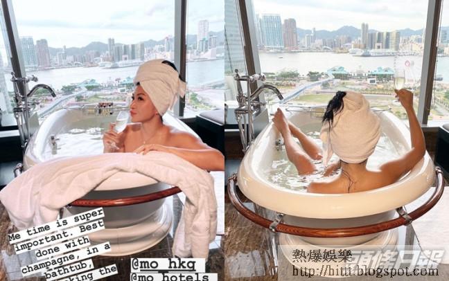 相中見她頭包浴毛,坐喺浴缸入面,赤裸背住鏡頭,面對落地玻璃,望住無敵維港靚景及摩天輪,Vicky還舉起手中的香檳,真係超爽,而她浸完浴後,還可趕及六點前落餐廳晚飯。至於喺限時動態放嘅係浸浴正面相,但浴巾巧妙地遮住重要位置,只見香肩。唔少網民讚她好識嘆,有指羨慕幫她影相嘅人,甚至有人讚她腳趾正!