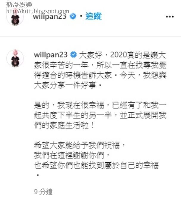 潘瑋柏留言:「大家好,2020真的是讓大家很辛苦的一年,所以一直在找尋我覺得適合的時機告訴大家。今天,我想與大家分享一件好事。是的,我現在很幸福,已經有了和我一起共度下半生的另一半,並正式展開我們的家庭生活希望大家能給予我們祝福,我們在這裏謝謝你們,也希望你們也能找到屬於自己的幸福。」突如其來嘅喜訊,嚇到好友周杰倫都留言:「哇靠」,好多網民都紛紛送上祝福!