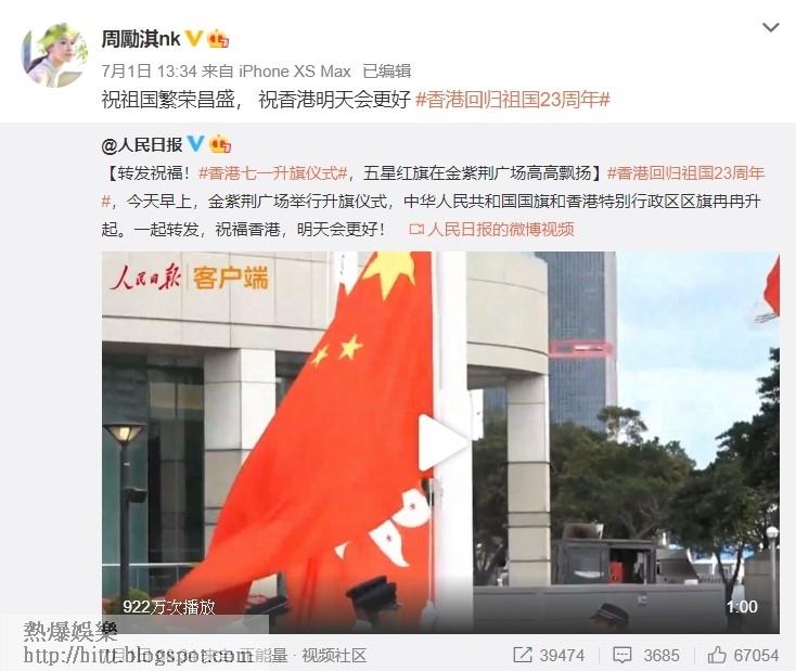 提到薑醋,雖周勵淇沒有post出自己與兒子的相片,但卻有在網上分享當媽的感受,包括疑問「派薑醋的起源」。之但係有網友卻不談薑醋,竟留言:「Congrats,BB混了祖國大陸的,難怪微博也要跟著列隊表效忠。」究竟在說什麼?原來周勵淇已很少在微博發帖,連當媽感受亦沒在微博提過,但7月1日卻記得在微博慶祝香港回歸紀念日:「祝祖國繁榮昌盛,祝香港明天會更好。」很有心,值得一讚!