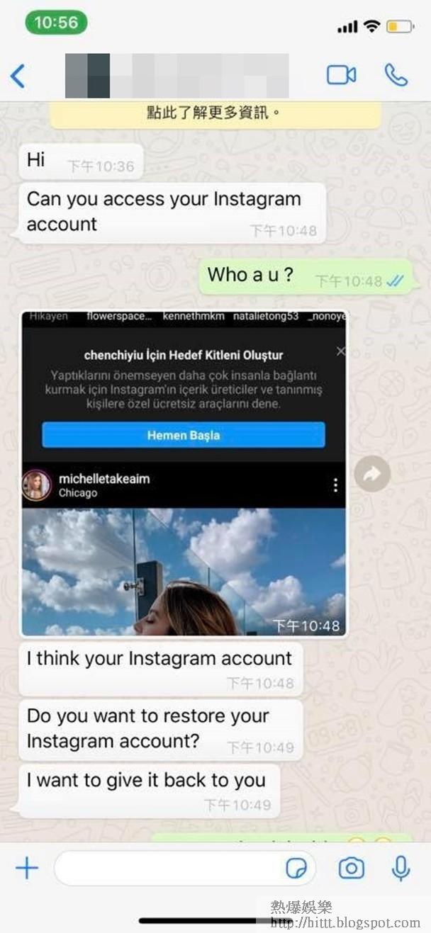 佢喺另一社交網平台表示:「緊急通知🔥🔥🔥🔥想告訴大家,今晚我的被黑客入侵,拿走我的戶口,或勒索我要錢,才能拿回戶口 ,我的戶口,已經被換上了那個男人的頭像,如果他用我的戶口向你們做任何事不當的事 ,請小心,💥💥💥💥那個不是我!所以我要在這裏緊急通知大家,請大家注意!🙏🏼🙏🏼🙏🏼🔥🔥🔥我正在找方法處理!」佢又上載同該男子對話,該人要求佢交出500元美金「贖回」帳號!