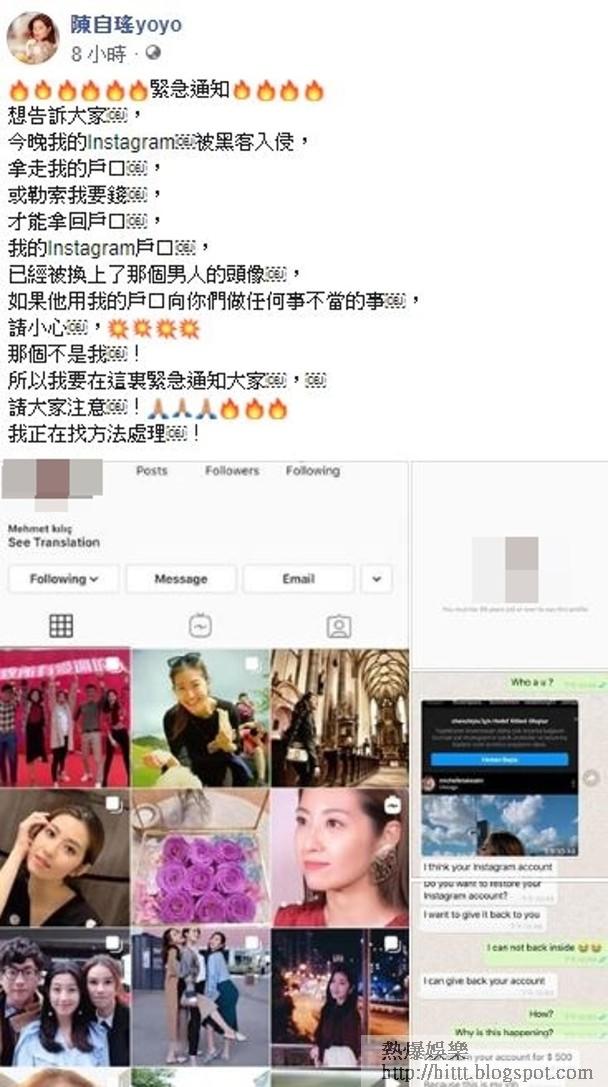 佢喺另一社交網平台表示:「緊急通知🔥🔥🔥🔥想告訴大家,今晚我的被黑客入侵,拿走我的戶口,或勒索我要錢,才能拿回戶口 ,我的戶口,已經被換上了那個男人的頭像,如果他用我的戶口向你們做任何事不當的事 ,請小心,💥💥💥💥那個不是我!所以我要在這裏緊急通知大家,請大家注意!🙏🏼🙏🏼🙏🏼🔥🔥🔥我正在找方法處理!」佢又上載同該男子對話,該人要求佢交出500元美金「贖回」帳號!