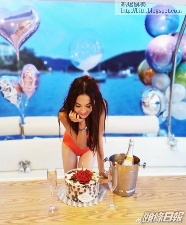保養得誼的Irene,穿上紅色一件頭泳裝示人,拎住大串氣球俯身為生日蛋糕吹蠟燭,又與老公作勢咀嘴,十分火辣,當然亦少不少與囝囝一家三口的溫馨合照。