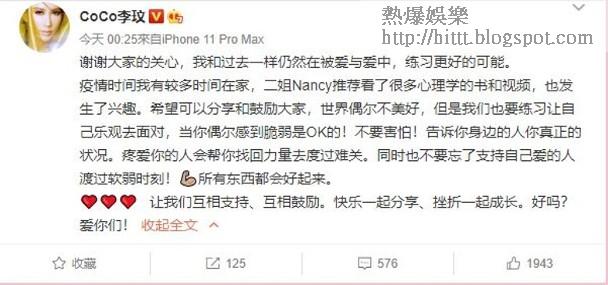 李玟發文指,在疫情期間,比較多時間留家,更在二姐推薦下狂睇心理學書和影片,又鼓勵網友即使偶有脆弱都要搵人傾訴:「謝謝大家的關心,我和過去一樣仍然在被愛與愛中,練習更好的可能。疫情時間我有較多時間在家,二姐Nancy推薦看了很多心理學的書和視頻,也發生了興趣。希望可以分享和鼓勵大家,世界偶爾不美好,但是我們也要練習讓自己樂觀去面對,當你偶爾感到脆弱是OK的!不要害怕!告訴你身邊的人你真正的狀況。疼愛你的人會幫你找回力量去渡過難關。同時也不要忘了支持自己愛的人渡過軟弱時刻!💪🏼所有東西都會好起來。❤️❤️❤️ 讓我們互相支持、互相鼓勵。快樂一起分享、挫折一起成長。好嗎?愛你們!」