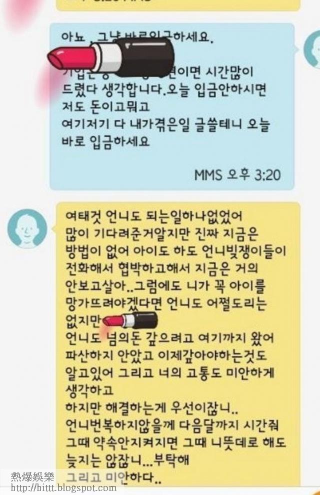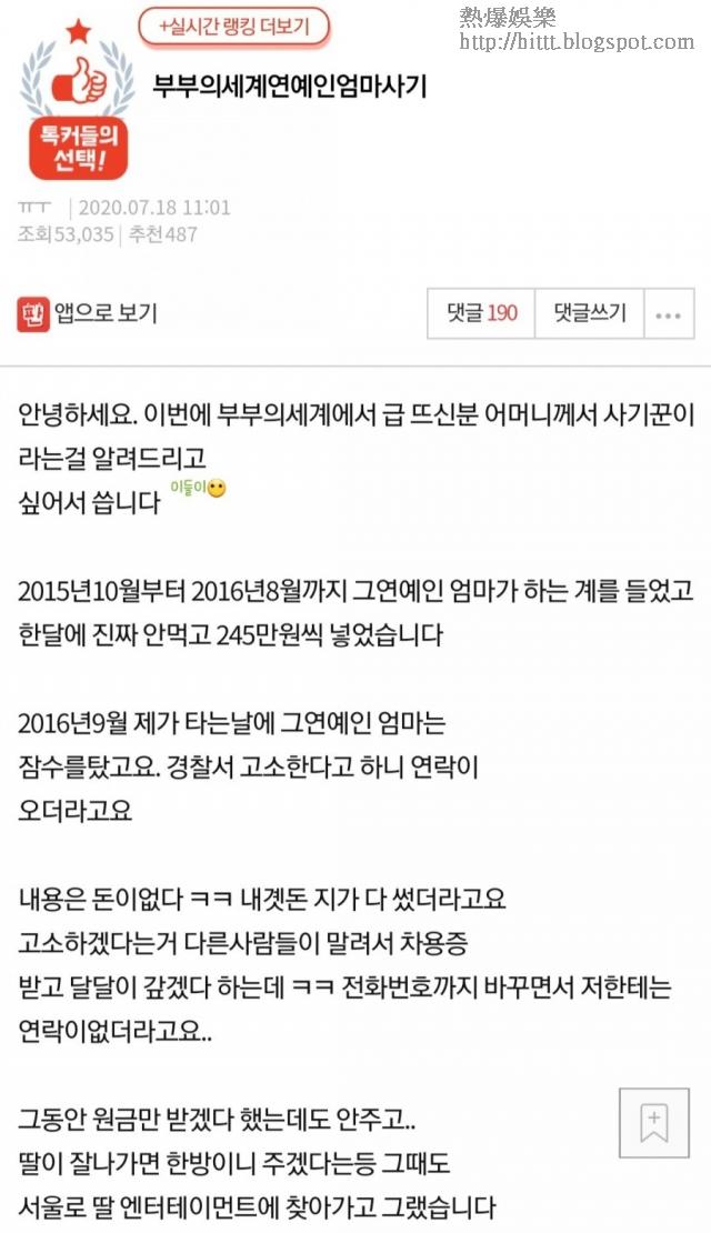 爆料者表示於2015年10月至2016年8月,曾將錢交予該女星的母親作投資用,但對方卻於2016年9月失蹤,涉及金額1,000萬韓圜(約6.4萬港元)。爆料者本想控告女星的母親,但女星的母親聲稱待女兒成名後會一次過還錢,之後亦曾分別還了數百至數千港元,但至今仍拖欠970萬韓圜(約6.2萬港元)。