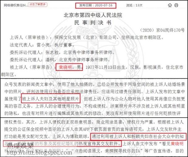 藝人Angelababy(楊穎)與老公黃曉明多次被傳離婚,但兩人沒有公開正式回應傳言,直至昨日(7月16日),因為某社交平台侵犯黃曉明肖像權,雙方產生糾紛而鬧上法庭,判決出爐,而案件判決書亦曝光,判罰侵權方要向黃曉明賠償8萬多元人民幣,而重點就落在雙方律師的辯論陳詞!