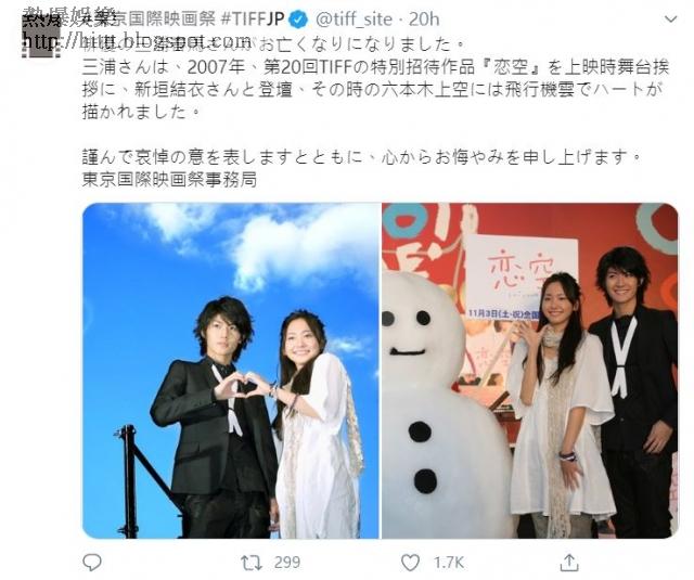 三浦春馬的死訊震驚全日本,東京國際電影節官方Twitter昨日亦有作出悼念,並回顧他在2007年與新垣結衣參與第20屆東京電影節盛會時的照片,當時兩位主角為催淚片《戀空》出席首映禮,在位於六本木的上映場地站台見影迷,兩人更甜蜜地用手一齊擺出心形手勢。《戀空》在日本累積票房達39億日圓(約2.8億港元),春馬與結衣BB當年盛傳戲假情真發展出地下情。