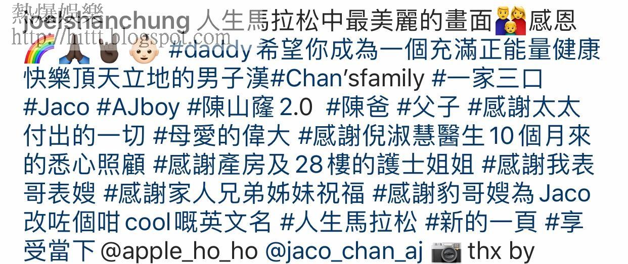 他又感謝好友豹哥單立文同老婆胡蓓蔚,為他兒子改了一個好cool的英文名:Jaco。已為人父,陳山聰亦急急為愛子開ig,暱稱陳山窿2.0,不過set了私人,BB動態可能稍後才公開。